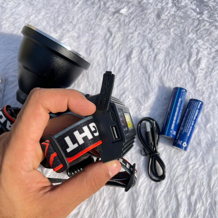 چراغ پیشانی شارژی Deepking DK-373 با LED پرقدرت 50 وات، زومدار و ضدآب، مجهز به باتری 18650 و شارژ سریع Type-C، مناسب کمپ و کوهنوردی. روشنایی حبابی