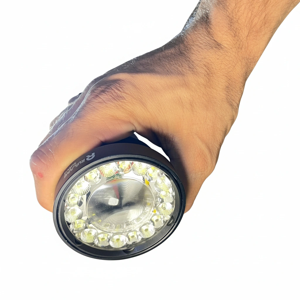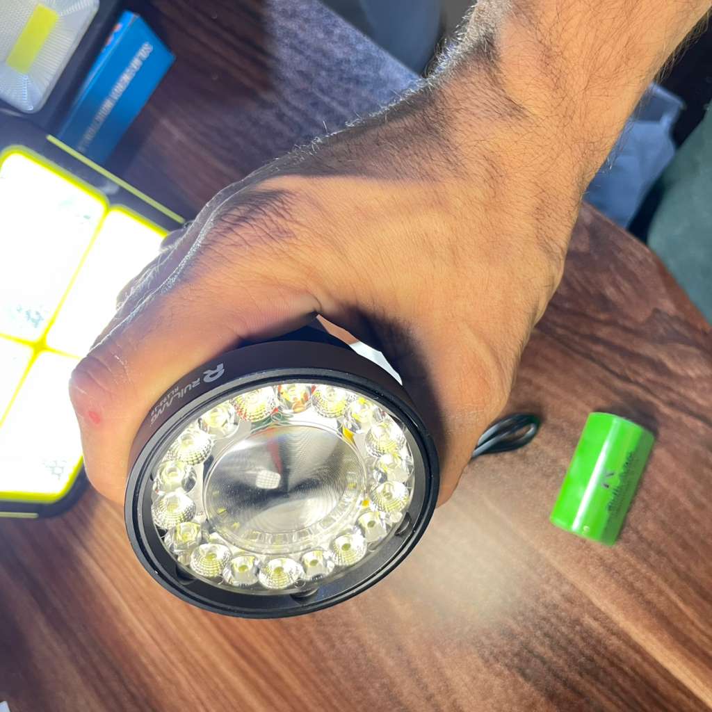 دور لنز مرکزی هم همونطور که تو عکس میبینی، یه رینگ دایرهای از ۱۸ LED کوچک با زاویه پخش باز نصب شده. اینا وظیفهی «روشن کردن فضای پیرامون» رو دارن و یه نور نَرَم و پهن تولید میکنن تا مثلاً برای کمپ یا کار در محیط نزدیک هم دید کافی داشته باشی.