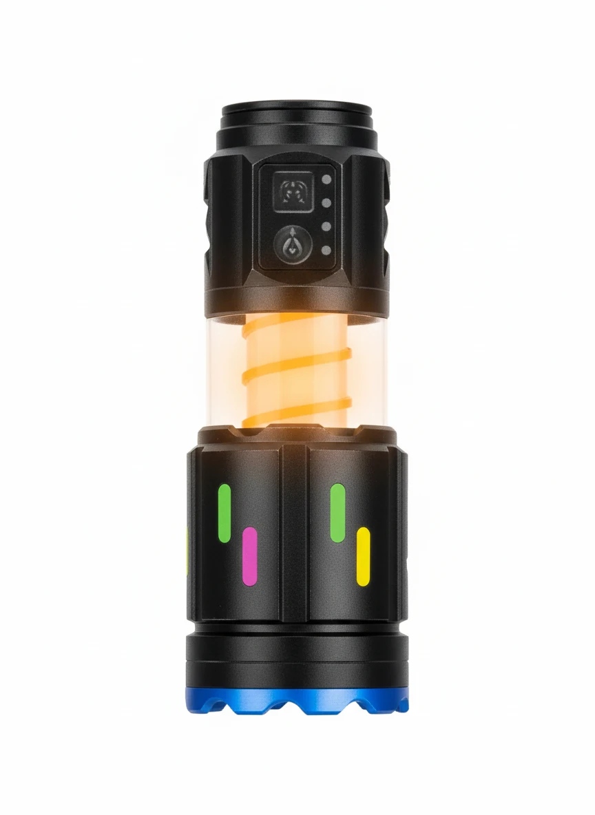 بدنهی فلزی مشکی با تزئینات رنگی نئونی، باتری قدرتمند ۵۰۰۰ میلیآمپرساعت و شارژ سریع Type‑C، این چراغ را به گزینهای عالی برای کمپینگ، نگهبانی، تعمیرات شبانه و سفرهای طبیعتگردی بدل کرده است.