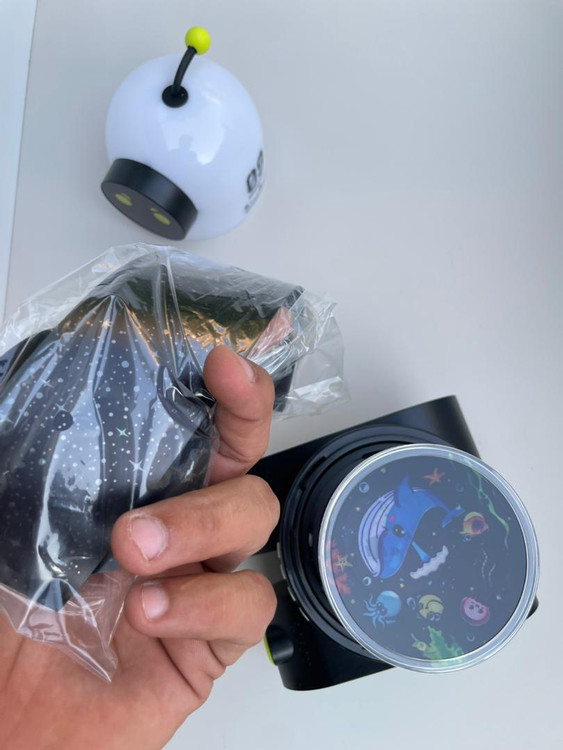 داخل بستهبندی چند عدسی و فیلتر مختلف هست (توی عکس میبینیم: یکی با طرح وال و موجودات دریایی، یکی با طرح ستارهها و کهکشان، یکی با نوشتههای جشن مثل Happy Birthday). این عدسیها رو میتونی جایگزین کنی تا تصویر خروجی پروژکتور عوض بشه.