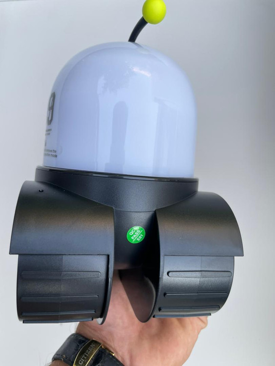 این چراغ خواب شکل یه ربات فانتزی آیندهنگر طراحی شده، که روی شاسی دارای چرخ و بدنهای سفید-مشکی با جزئیات سبز نئون هست.