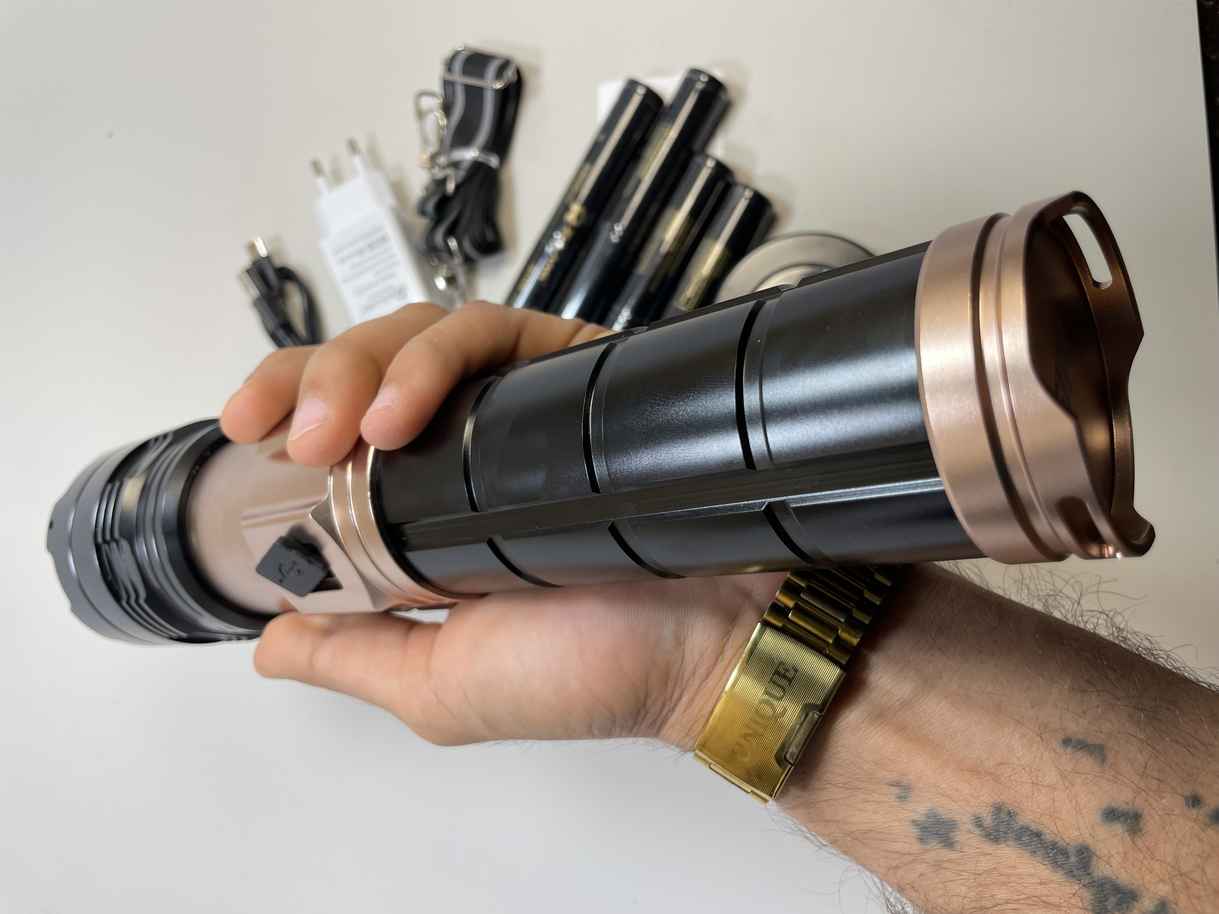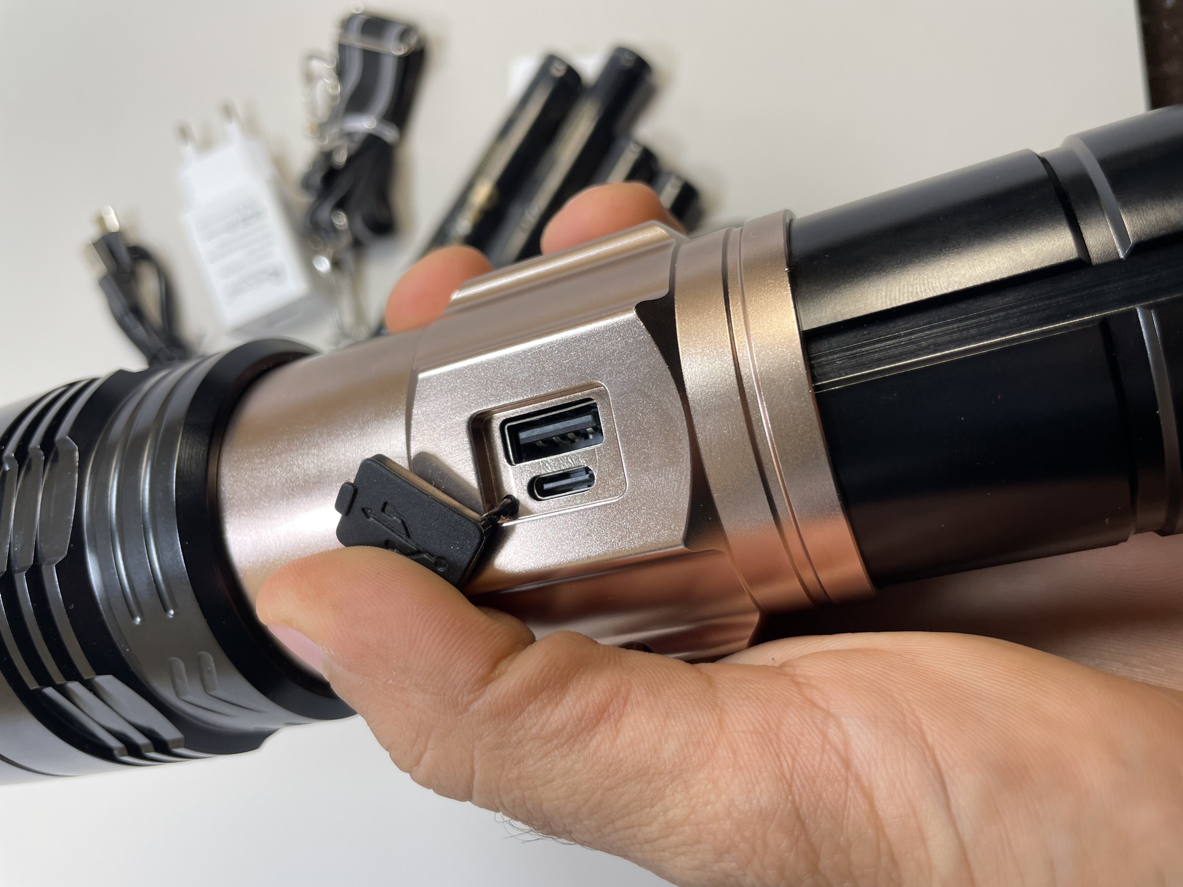 - عملکرد پاوربانک (پاوربانک داخلی): این چراغ قوه مجهز به یک پورت خروجی USB است. این یعنی شما میتوانید در مواقع اضطراری از باتریهای داخلی آن برای شارژ کردن دستگاههای دیگر مانند گوشی موبایل یا هدفون خود استفاده کنید.
