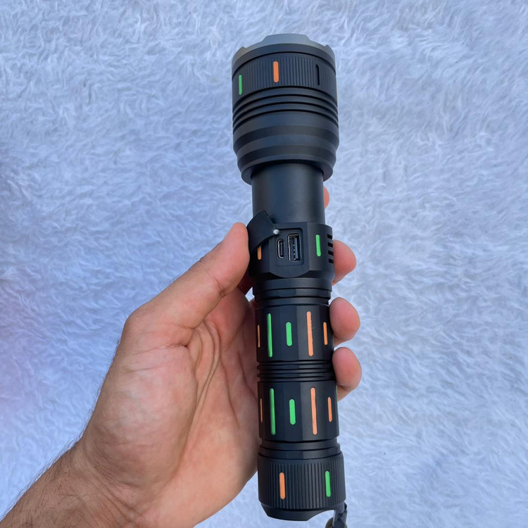 جنس بدنه آلومینیوم مقاوم، رنگبندی چراغهای جانبی (سبز و نارنجی) و دکمه لمسی با طراحی مدرن، تجربهای متفاوت از یک چراغقوه حرفهای را به شما میدهد. علاوه بر این، باتری پرقدرت 8000 میلیآمپرساعت، امکان کار تا 9 ساعت مداوم را فراهم کرده و با درگاه USB تعبیهشده، قابلیت شارژ آسان دارد.